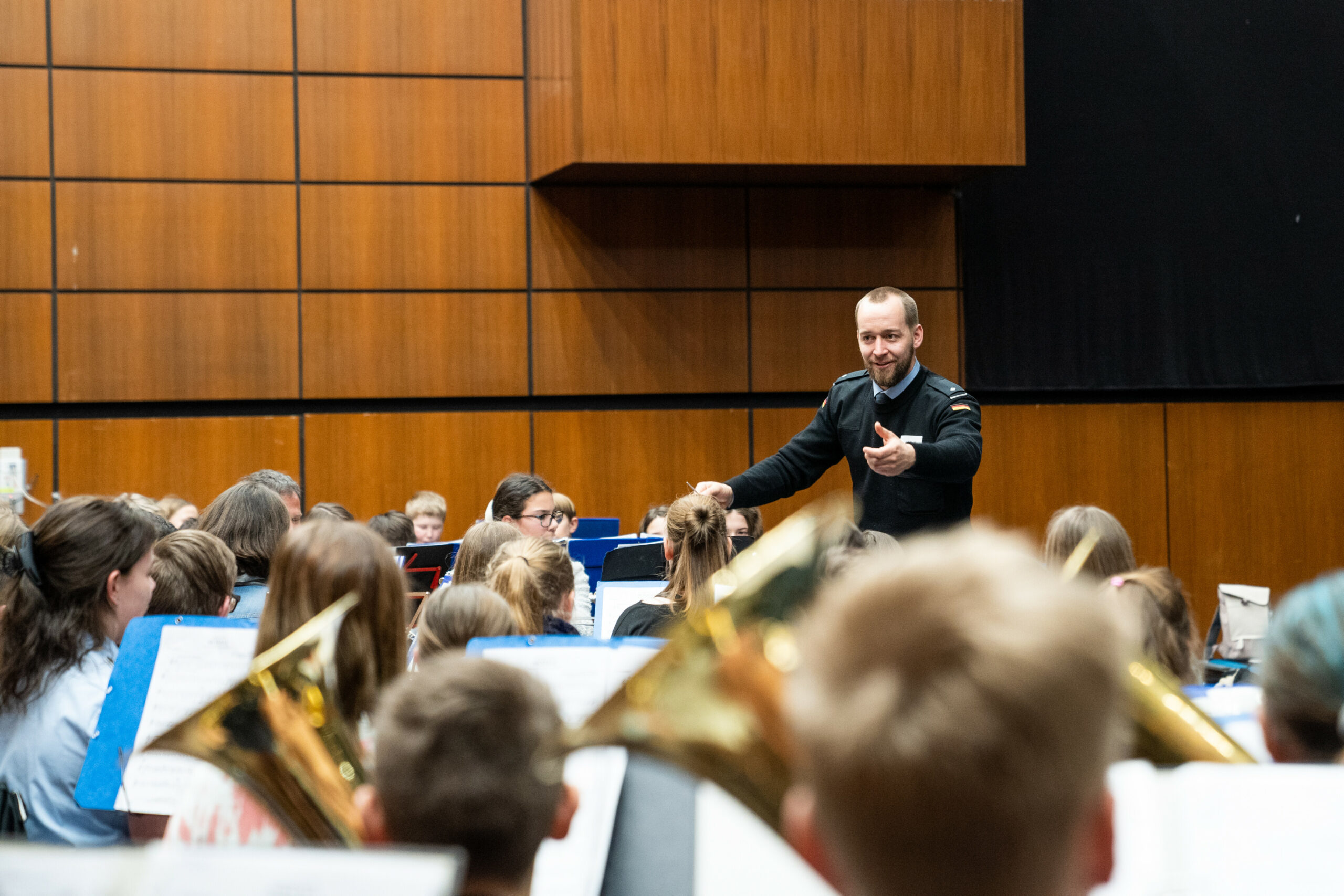 Seit zwei Jahren lernen die Schülerinnen und Schüler im regulären Musikunterricht ein Blasinstrument und spielen auch sofort gemeinsam im Ensemble. Als ein einmaliges musikalisches Ereignis waren die Bläserklassentage die ideale Ergänzung zum schulischen Unterricht: Die Schülerinnen und Schüler wurden von Musikerinnen und Musikern des Musikkorps unterrichtet; in kleinen Gruppen wurden die einzelnen Stücke mit den jungen Bläserinnen und Bläsern geprobt. „Die musikalische Arbeit mit einem Profi und das anschließende Spiel im gemeinsamen Ensemble wird für die teilnehmenden Kinder ein Erlebnis sein, das ihre künstlerische Entwicklung sicherlich nachhaltig beeinflussen wird“, sagt Prof. Dr. Wolfgang Pfeiffer, der Projektleiter von klasse.im.puls.