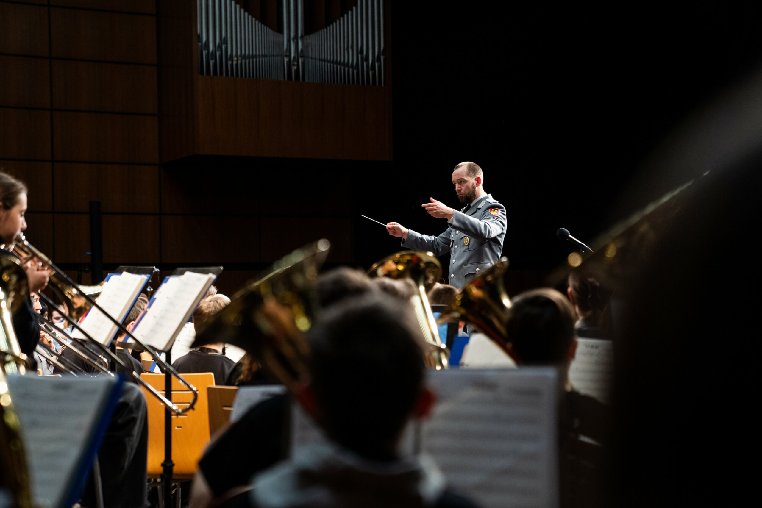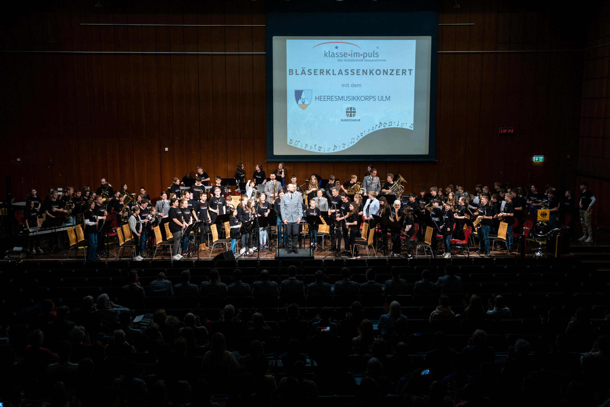 Für rund 100 Schülerinnen und Schüler ging am 15. März 2023 ein großer Traum in Erfüllung: Zusammen mit dem Heeresmusikkorps Ulm gaben die jungen Musikerinnen und Musiker der klasse.im.puls-Bläserklassen ein großes Konzert in der Aula des FAU-Campus in der Regensburger Straße in Nürnberg.